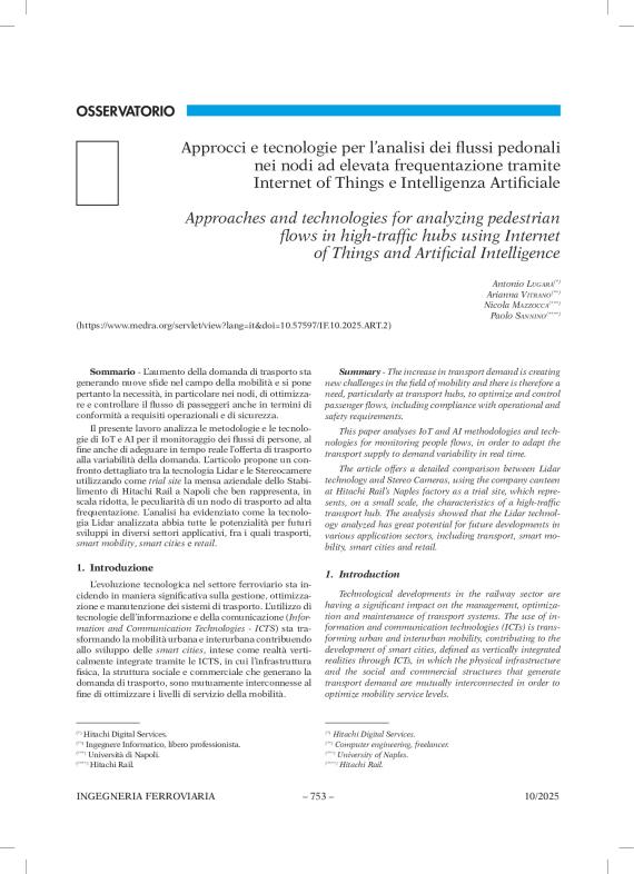 Sommario - L’aumento della domanda di trasporto sta generando nuove sfide nel campo della mobilità e si pone pertanto la necessità, in particolare nei nodi, di ottimizzare e controllare il flusso di passeggeri anche in termini di conformità a requisiti operazionali e di sicurezza. Il presente lavoro analizza le metodologie e le tecnologie di IoT e AI per il monitoraggio dei flussi di persone, al fine anche di adeguare in tempo reale l’offerta di trasporto alla variabilità della domanda. L’articolo propone un confronto dettagliato tra la tecnologia Lidar e le Stereocamere utilizzando come trial site la mensa aziendale dello Stabilimento di Hitachi Rail a Napoli che ben rappresenta, in scala ridotta, le peculiarità di un nodo di trasporto ad alta frequentazione. L’analisi ha evidenziato come la tecnologia Lidar analizzata abbia tutte le potenzialità per futuri sviluppi in diversi settori applicativi, fra i quali trasporti, smart mobility, smart cities e retail.
