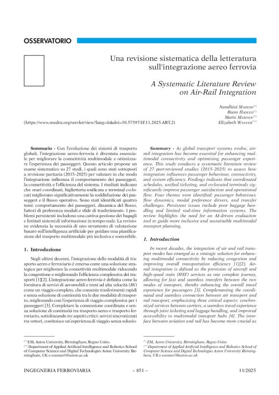 Sommario - Con l’evoluzione dei sistemi di trasporto globali, l’integrazione aereo-ferrovia è diventata essenziale per migliorare la connettività multimodale e ottimizzare l’esperienza dei passeggeri. Questo articolo propone un esame sistematico su 27 studi, i quali sono stati sottoposti a revisione paritaria (2015–2025) per valutare in che modo l’integrazione influenza il comportamento dei passeggeri, la connettività e l’efficienza del sistema. I risultati indicano che orari coordinati, biglietteria unificata e terminal co-locati migliorano significativamente la soddisfazione dei passeggeri e il flusso operativo. Sono stati identificati quattro temi: comportamento dei passeggeri, dinamica del flusso, fattori di preferenza modali e sfide di trasferimento. I problemi persistenti includono una cattiva gestione dei bagagli e limitati sistemi di informazione in tempo reale. La revisione evidenzia la necessità di uno strumento di valutazione basato sull’intelligenza artificiale per guidare una pianificazione del trasporto multimodale più inclusiva e sostenibile.