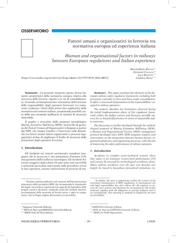 Summary - This paper examines key elements of the European railway safety regulatory framework, including both provisions currently in force and those under consolidation. It offers a structured interpretation of the responsibilities1 assigned to railway operators. The analysis identifies key limitations observed during the initial implementation phase of this regulatory framework within the Italian context and discusses possible reasons for its limited effectiveness in terms of measurable safety